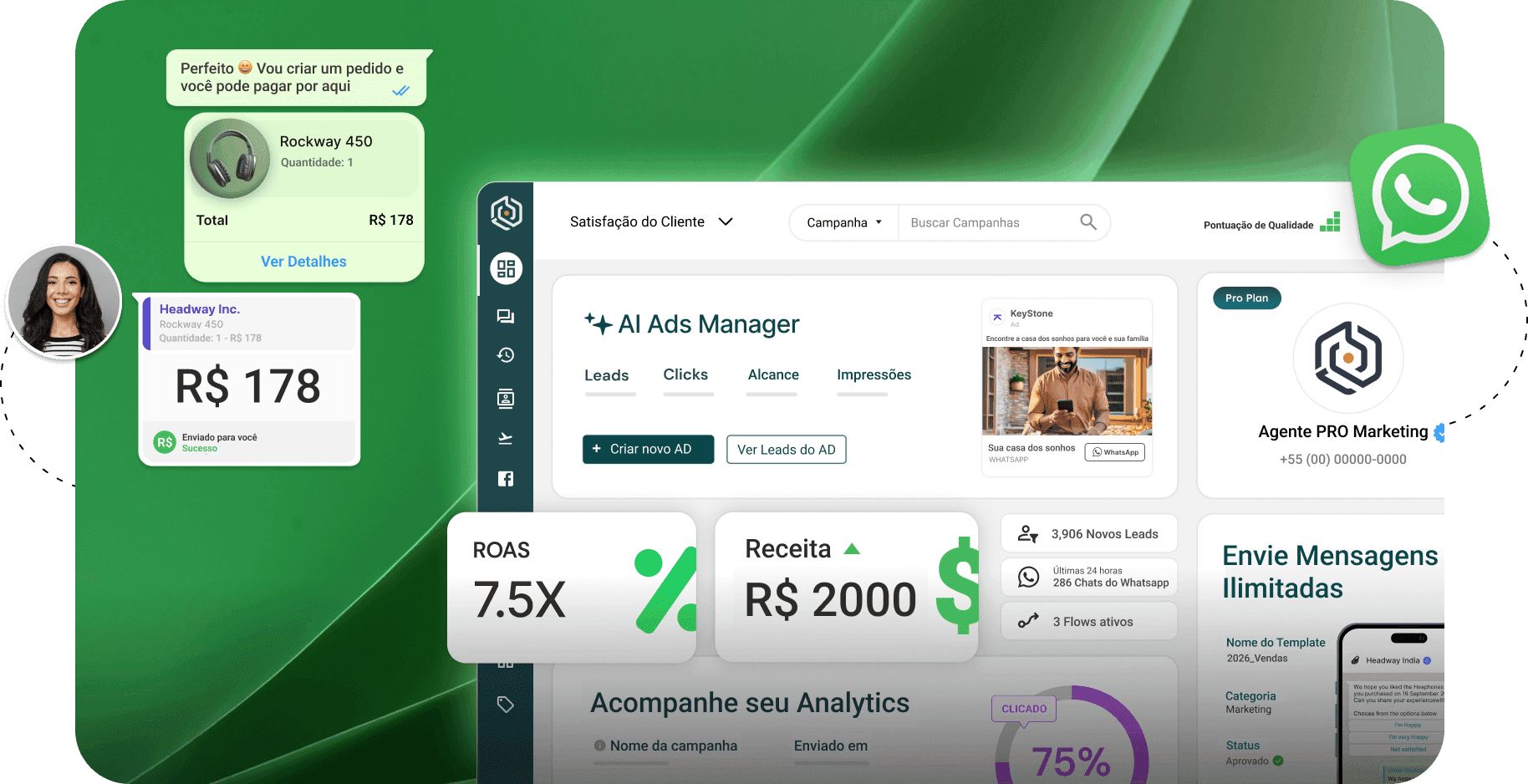 • Crie anúncios impactantes com o Agente PRO que direcionam os usuários para o WhatsApp.